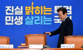 이재명 더불어민주당 대표와 박찬대 원내대표가 4일 오전 국회에서 열린 최고위원회의에 참석해 대화를 나누고 있다.이날 이 대표는 "가계와 기업이 어려우면 정부가 나서는 게 기본"이라며 "추가경정예산이든 민생회복지원금이든 뭐든 하자"고 정부·여당에 제안했다.