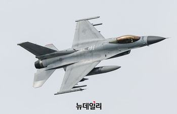 대한민국 공군 KF-16 전투기가 25일 오전 경기 성남시 서울공항에서 열린 제 76주년 국군의 날 기념식 미디어데이에서 급선회 기동을 선보이고 있다. (경기 성남=서성진 기자)