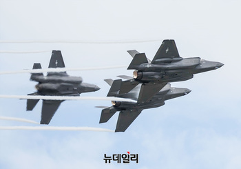 대한민국 공군 F-35A 스텔스 전투기가 25일 오전 경기 성남시 서울공항에서 열린 제 76주년 국군의 날 기념식 미디어데이에서 편대비행을 선보이고 있다. (경기 성남=서성진 기자)