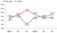 한나라당이 지지율 회복세를 보이면서 2주 연속 민주당을 오차범위 내에서 앞선 것으로 나타났다. 여론조사 전문기관 리얼미터의 6월 셋째주 주간 정례조사 결과, 한나라당 지지율은 32.5%(▲0.6%p)를 기록했고, 민주당은 31.8%(▲0.1%p)의 지지율을 기록, 한나