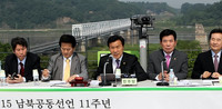 손학규 민주당 대표는 15일 “남북은 평화라는 대의를 위해 남북정상회담을 다시 추진할 것을 촉구한다”고 밝혔다. 민주당은 6.15 남북정상회담 11주년을 맞은 이날 임진각 통일전망대에서 최고위원회의를 열고 정부에 대북정책 기조를 전환할 것을 촉구했다.손 대표는 “우리가