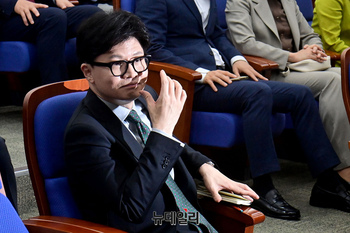한동훈 국민의힘 당대표가 26일 오전 국회에서 열린 의원총회에 참석해 의원들의 발언을 듣고 있다.