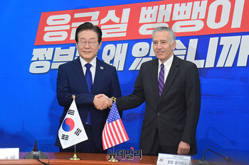 이재명 더불어민주당 대표가 26일 오전 국회에서 필립 골드버그 주한미국대사를 접견하고 악수하고 있다.