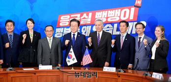 이재명 더불어민주당 대표가 26일 오전 국회에서 필립 골드버그 주한미국대사를 접견하고 기념촬영을 하고 있다.