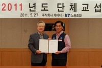KT(회장 이석채 www.kt.com)와 KT노동조합(위원장 김구현)은 1개월간의 협상 끝에 2011년도 단체 교섭을 타결하면서 지난 2001년부터 11년 연속 무분규 단체 교섭을 달성했다고 30일 밝혔다. 이번 타결 내용에는 ▲ 선택적 근로시간제도 도입 ▲ 타임오프제