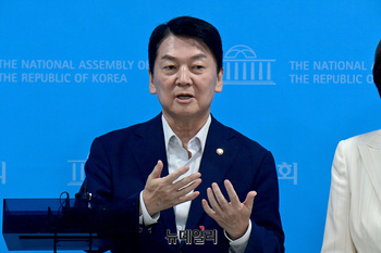 안철수 국민의힘 딥페이크 디지털 성범죄 대응 특별위원회 위원장 및 소속 의원들이 25일 오전 국회 소통관에서 딥페이크 근절 대책을 발표한 후 기자들의 질문에 답하고 있다.