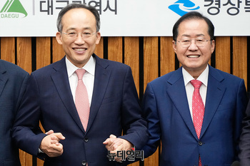 추경호 국민의힘 원내대표와 홍준표 대구광역시장이 24일 오전 서울 여의도 국회에서 열린 대구·경북 지역 민생 예산정책협의회에서 기념촬영을 하고 있다.