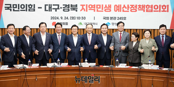 추경호 국민의힘 원내대표를 비롯한 참석자들이 24일 오전 서울 여의도 국회에서 열린 대구·경북 지역 민생 예산정책협의회에서 기념촬영을 하고 있다.