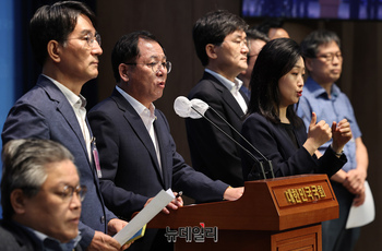 이상휘 국민의힘 미디어특위 위원장과 공정언론국민연대가 24일 오전 국회소통관에서 방심위 민원인 정보유출 사건과 관련해 민주당의 청문회 강행을 규탄하는 기자회견을 갖고 있다.이들은 회견문을 통해 "민주당의 청문회 강행은 부당하고 부도덕한 행위"라며 "개인정보와 정부 기록