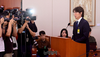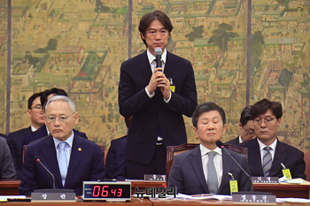 홍명보 대한민국 축구대표팀 감독이 24일 국회에서 열린 문화체육관광위원회의 대한축구협회 등에 대한 현안질의에서 의원 질문에 답하고 있다.