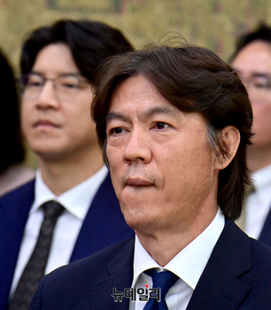 홍명보 대한민국 축구대표팀 감독이 24일 국회에서 열린 문화체육관광위원회의 대한축구협회 등에 대한 현안질의에 축석해 굳은 얼굴로 앉아 있다.