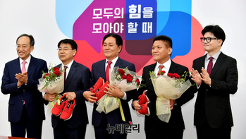 한동훈 국민의힘 대표가 23일 국회에서 열린 당 재보궐선거 후보자 추천장 수여식에서 기념촬영을 하고 있다.(왼쪽 두 번째부터 부산 금정구청장 후보로 추천된 윤일현, 인천 강화군수 후보로 추천된 박용철, 전남 곡성군수 후보로 추천된 최봉의)