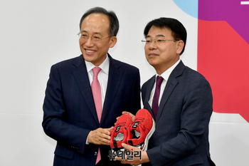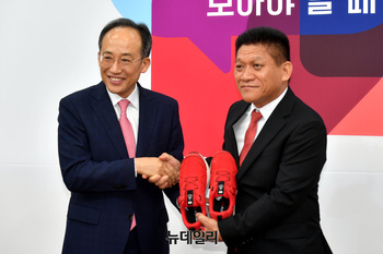 추경호 국민의힘 원내대표가 23일 오전 국회에서 열린 10.16 재보궐선거 후보자 추천장 수여식에서 최봉의 전라남도 곡성군수 후보자에게 운동화를 전달하고 있다.