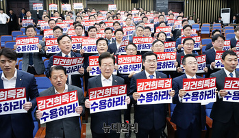 더불어민주당 의원들이 19일 오후 서울 여의도 국회에서 열린 의원총회에서 '김건희 특검 수용하라!' '김건희 여사 공천개입 규탄한다!' 문구가 적힌 피켓을 들고 구호를 외치고 있다.