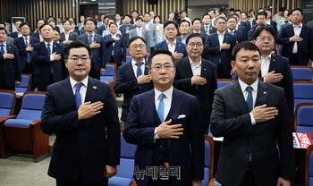 더불어민주당 의원들이 19일 오후 국회에서 열린 의원총회에서 국민의례를 하고 있다.