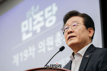 이재명 더불어민주당 대표가 19일 오후 서울 여의도 국회에서 열린 의원총회에서 모두발언을 하고 있다.