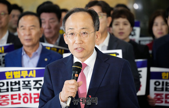 추경호 국민의힘 원내대표가 19일 오후 서울 여의도 국회에서 본회의를 앞두고 더불어민주당 규탄 발언을 하고 있다.