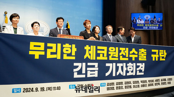 김정호 더불어민주당 의원을 비롯한 참석자들이 19일 오전 서울 여의도 국회 소통관에서 '무리한 체코원준수출 규탄 긴급 기자회견'을 하고 있다.