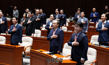 추경호 국민의힘 원내대표와 의원들이 19일 오후 서울 여의도 국회에서 열린 비상의원총회에서 국민의례를 하고 있다.