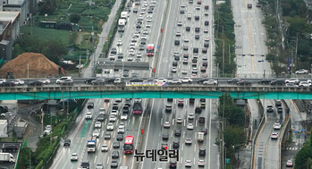 추석 연휴를 앞둔 13일 오후 경찰청 헬기에서 본 경부고속도로가 귀성 차량으로 가득 차 있다. 한국도로공사는 이날 전국에서 자동차 558만대가 고속도로를 이용할 것으로 예상했다. 수도권에서 지방으로 43만대, 지방에서 수도권으로 48만대가 이동할 것으로 전망했