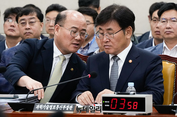 유상임 과학기술정보통신부 장관과 이창윤 1차관이 9일 오전 서울 여의도 국회에서 열린 과학기술정보방송통신위원회 전체회의에서 대화를 나누고 있다.