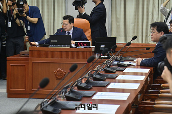 박찬대 더불어민주당 원내대표가 9일 오전 국회에서 열린 국회운영위원회 전체회의에서 의사봉을 두드리고 있다. 이날 회의에는 배준영 국민의힘 원내수석대표만 참석했다.