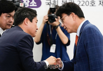 한동훈 국민의힘 대표와 윤상현 의원이 9일 오전 서울 여의도 국회에서 열린 '지역당 부활과 정당정치활성화를 위한 국회토론회'에서 악수를 나누고 있다.