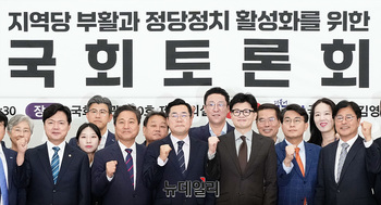 한동훈 국민의힘 대표, 박찬대 더불어민주당 원내대표, 윤상현 국민의힘 의원과 김영배 더불어민주당 의원을 비롯한 참석자들이 9일 오전 서울 여의도 국회에서 열린 '지역당 부활과 정당정치활성화를 위한 국회토론회'에서 기념촬영을 하고 있다.