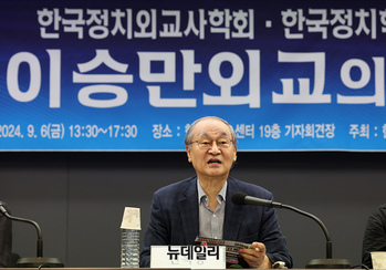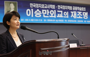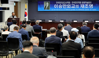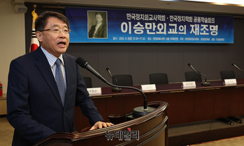 윤왕희 성균관대 교수가 6일 오후 서울 중구 한국프레스센터에서 '이승만외교의 재조명'을 주제로 열린 한국정치외교사학회와 한국정치학회 공동학술회의에서 인사말을 하고 있다. 토론에는 신복룡 전 건국대 석좌교수, 김용호 서울대 아시아연구소 방문학자의 사회로 2부로
