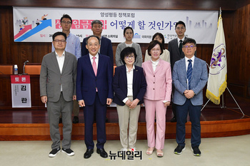 추경호 국민의힘 원내대표 등 참석자들이 6일 오전 국회 도서관에서 열린 양성평등정책포럼 '성별 임금 격차 어떻게 할 것인가' 토론회 에서 시작 전 기념촬영을 하고 있다.