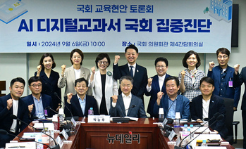 'AI 디지털교과서 국회 집중진단' 토론회 6일 오전 국회 의원회관에서 열린 가운데 진선미 더불어민주당 의원 등 참석자들이 기념촬영을 하고 있다.