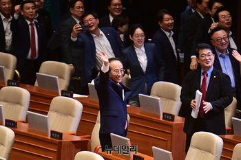 [포토] 방청석 향해 손흐드는 추경호 국민의힘 원내대표
