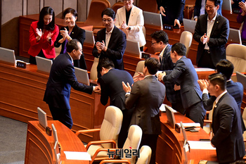 추경호 국민의힘 원내대표가 5일 오전 국회에 열린 본회의에서 국정에 관한 교섭단체대표연설을 마치고 동료의원들과 인사를 나누고 있다.