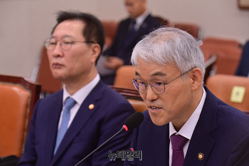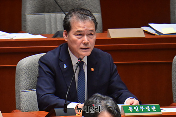 김영호 통일부 장관이 2일 오전 국회에서 열린 예산결산특별위원회 전체회의에서 의원들의 질문에 답하고 있다.