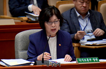강정애 보훈부 장관이 2일 오전 국회에서 열린 예산결산특별위원회 전체회의에서 의원들의 질문에 답하고 있다.