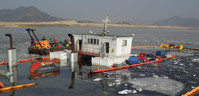 낙동강 15공구 강바닥에 가라앉은 준설선 인양이 예정보다 지연될 전망이다. 4대강추진본부는 지나달 22일 새벽 수중준설 작업 중 기울면서 침수된 준설선을 인양하기 위해 선체 안에 들어간 물을 빼내는 중이라고 밝혔다. 현재 선체 안에 있던 기름 4만여L를 모두 제거한 상
