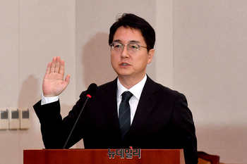 심우정 검찰총장 후보자가 3일 오전 국회 법제사법위원회에서 열린 인사청문회에서 선서를 하고 있다.