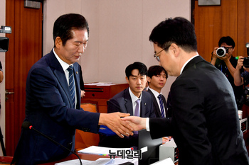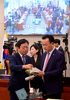 유상범 국회 법제사법위원회 여당 간사와 김승원 야당 간사가 3일 오전 국회 법제사법위원회에서 열린 인사청문회에서 심우정 검찰총장 후보자의 자료제출을 두고 논의하고 있다.