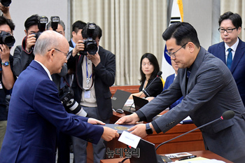안창호 국가인권위원회 위원장 후보자가 3일 국회에서 열린 인사청문회에서 선서문을 박찬대 위원장에게 전달하고 있다.
