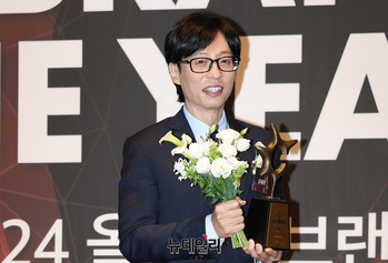 유재석이 3일 오전 서울 중구 신라호텔에서 열린 '2024 올해의 브랜드 대상' 시상식에서 포즈를 취하고 있다. 유재석은 올해 남자예능인 부문에서 5년 연속 대상을 수상했다. 국내 인물부문에는 △유재석(예능인-남) △변우석(남자배우-핫트랜드) △키스오브라이프(