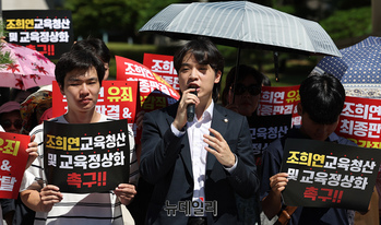 최인호 관악구의원이 조희연 서울교육감의 상고심 선고일인 29일 오전 서울 서초구 대법원 앞에서 자유민주교육국민연합(상임공동대표 김태영, 박소영) 주최로 열린 교육 정상화 촉구 기자회견에서 발언하고 있다. 대법원은 이날 오전 직권남용권리행사방해와 국가공무원법 위