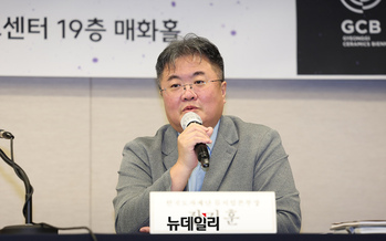 '2024경기도자비엔날레' 예술감독을 맡은 임미선 감독이 28일 오후 서울 중구 한국프레스센터에서 열린 기자간담회에서 비엔날레 소개를 하고 있다. 임 예술감독은 "오늘날 현대사회에 만연한 이념적, 민족적, 종교적, 정치적, 경제적인 갈등부터 디지털 시대에서 비
