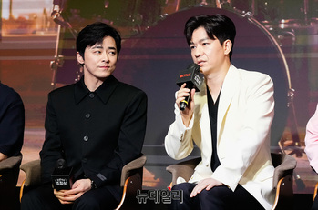 양정우, 이정원 PD가 27일 오후 서울 마포구 호텔 나루 엠갤러리에서 열린 넷플릭스 예능 '신인가수 조정석' 제작발표회에서 취재진의 질문에 답하고 있다.넷플릭스 예능 '신인가수 조정석'은 싱어송라이터를 꿈꾸는 '음악에 진심'인 20년차 배우 조정석의 신인 가수 데뷔