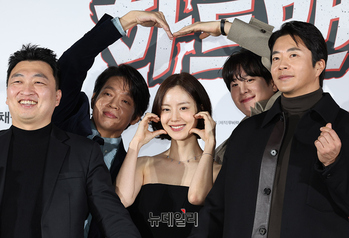 최원섭 감독과 주연배우들이 11일 오전 서울 광진구 롯데시네마 건대입구점에서 열린 영화 '하트맨(연출 최원섭)' 제작보고회에서 포즈를 취하고 있다. ‘하트맨’은 돌아온 남자 승민(권상우)이 다시 만난 첫사랑을 놓치지 않기 위해 고군분투 하지만, 그녀에게 절대