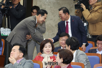 장동혁 국민의힘 대표가 11일 국회에서 열린 의원총회에 참석하며 의원들과 악수를 나누고 있다.