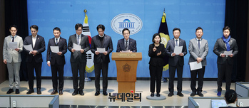 김상욱·김용만·김용민·김태선·김한규·모경종·박상혁·박주민·이용우·장철민·전용기·한준호 더불어민주당 의원이 11일 오후 국회 소통관에서 국민의힘의 전면적인 필리버스터를 규탄하는 기자회견을 하고 있다.