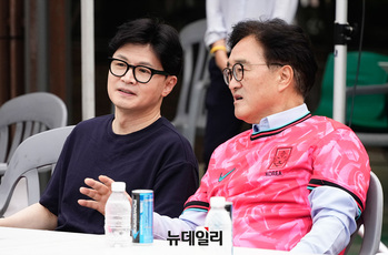 우원식 국회의장과 한동훈 국민의힘 대표가 26일 오후 서울 여의도 국회 운동장에서 열린 제22대 국회개원 기념 여야 국회의원 축구대회에서 대화를 나누고 있다.