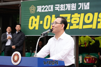 주호영 국회 부의장이 26일 오후 서울 여의도 국회 운동장에서 열린 제22대 국회개원 기념 여야 국회의원 축구대회에서 축사를 하고 있다.