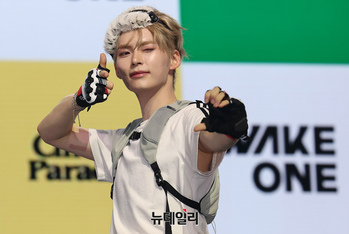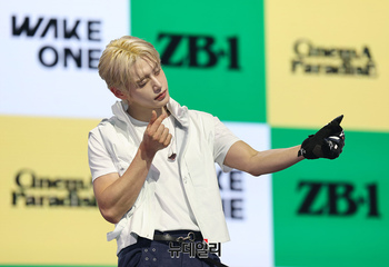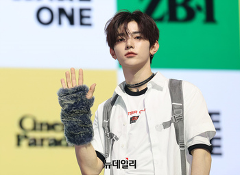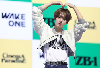 제로베이스원 김지웅이 26일 오후 서울 용산구 블루스퀘어에서 열린 미니 4집 '시네마 파라다이스' 쇼케이스에서 포즈를 취하고 있다. 이번 앨범은 '다양한 삶의 과정에서 나쁜 상황에도 불구하고 해피엔딩을 꿈꾸는 사람들을 응원'하는 메시지를 담았다. 타이틀곡 '굿