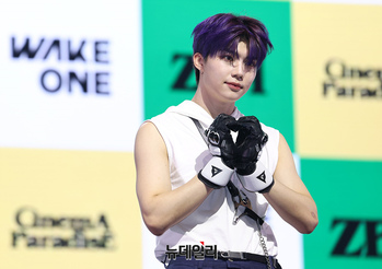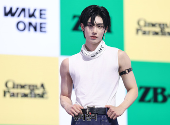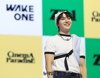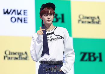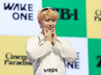 제로베이스원 리더 성한빈이 26일 오후 서울 용산구 블루스퀘어에서 열린 미니 4집 '시네마 파라다이스' 쇼케이스에서 포즈를 취하고 있다. 이번 앨범은 '다양한 삶의 과정에서 나쁜 상황에도 불구하고 해피엔딩을 꿈꾸는 사람들을 응원'하는 메시지를 담았다. 타이틀곡